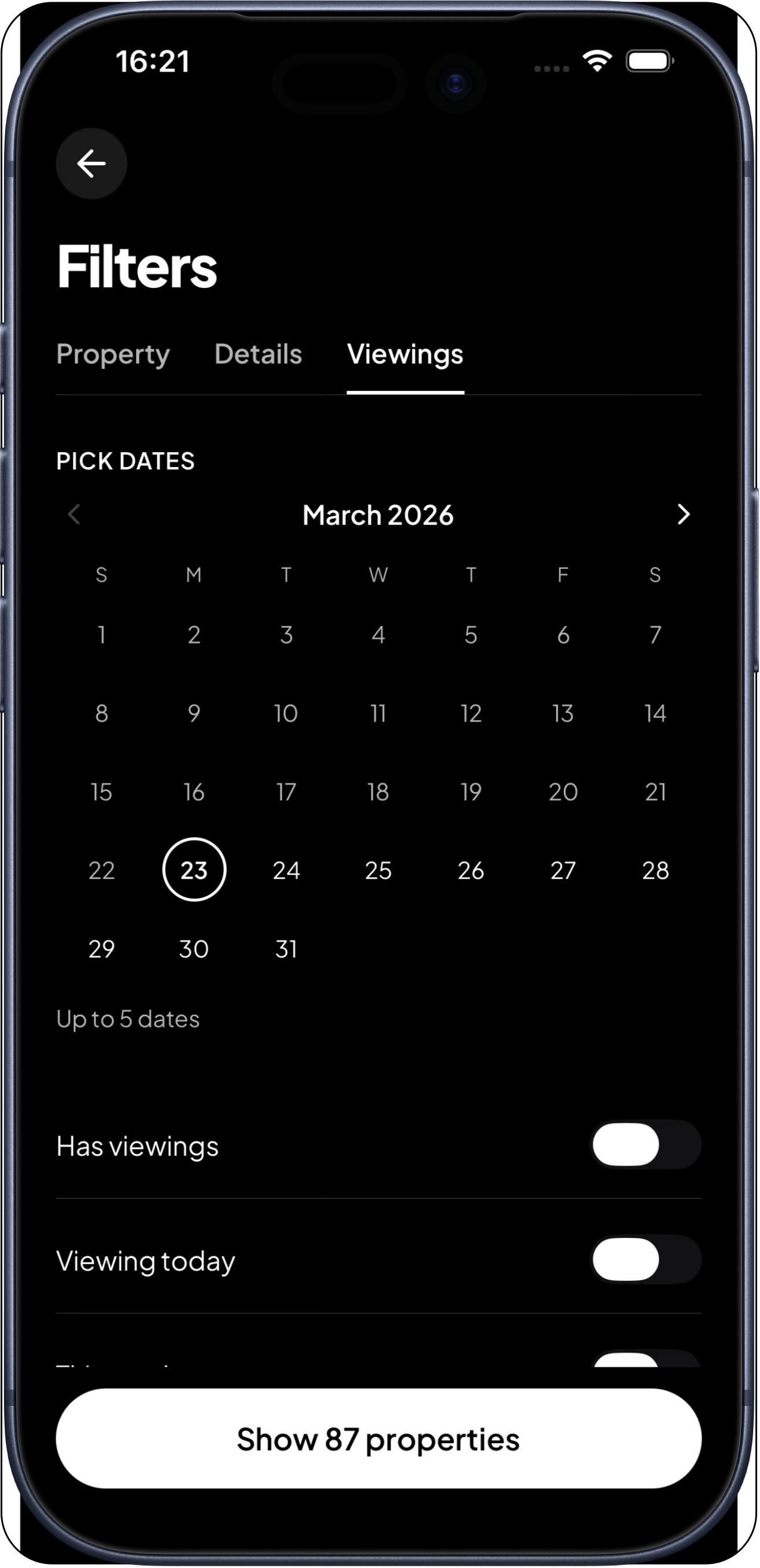Every property shows real-time open house dates. Filter by today, this week, or pick a specific date. No guessing if a flat is available.